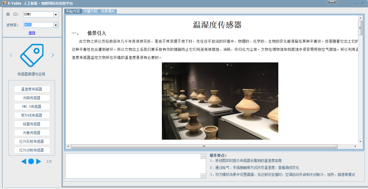 在C#軟件上有每一個(gè)教學(xué)實(shí)驗(yàn)資源,包含實(shí)驗(yàn)?zāi)康模瑢?shí)驗(yàn)原理,實(shí)驗(yàn)內(nèi)容,實(shí)驗(yàn)步驟,實(shí)驗(yàn)過程,實(shí)驗(yàn)現(xiàn)象以及對(duì)應(yīng)場景應(yīng)用,能夠讓學(xué)生不僅學(xué)習(xí)傳感器概念,原理,開發(fā),還能學(xué)以致用。