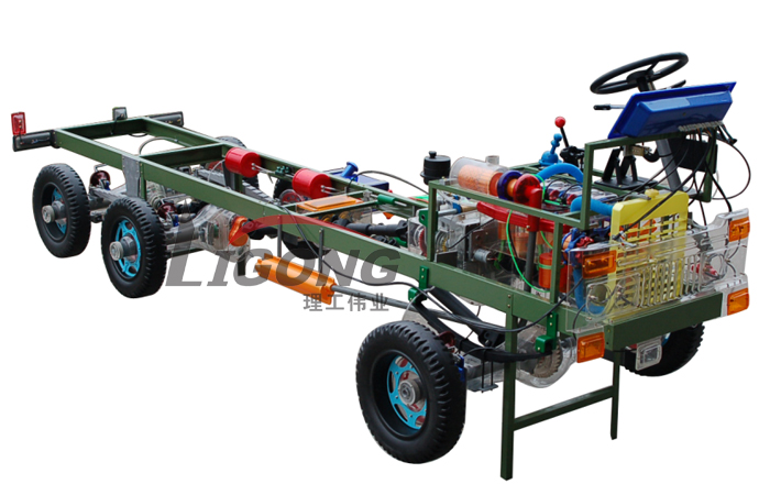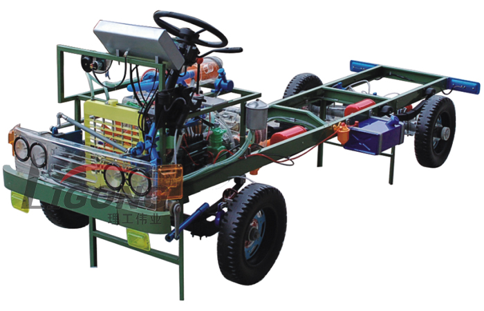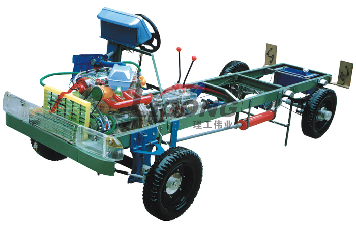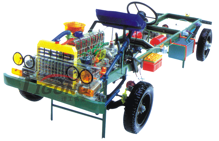 本品選用透明有機(jī)玻璃制作,內(nèi)中部件均以硬質(zhì)塑料料加工,用 螺絲固定在金屬高溫烘漆而成的車架上。各總成部分都以壓模成形加 工,代替過(guò)去膠粘合的方法,使產(chǎn)品在強(qiáng)度上有很大提高。發(fā)動(dòng)機(jī)總成用電機(jī)驅(qū)動(dòng),在油門處設(shè)有調(diào)速裝置,能演示發(fā)動(dòng)機(jī)轉(zhuǎn)速高低。離合器分離明顯,操縱靈活,離合器外殼整體壓模而成,變速箱和各檔齒輪用各種顏色表示,換檔靈活,手制動(dòng)美觀。后橋外形壓模而成,內(nèi)中主減速、差速轉(zhuǎn)動(dòng)自如,輪轂剎蹄壓模成型,剎蹄可調(diào)節(jié),前橋輪鼓可調(diào)整,轉(zhuǎn)向裝置以及電瓶、油箱、水箱,制動(dòng)管路分布清楚一目了然。電路采用對(duì)插件前后分布,燈架、風(fēng)窗、儀表板、后燈架用透明有機(jī)玻璃壓模成整體美觀逼真。