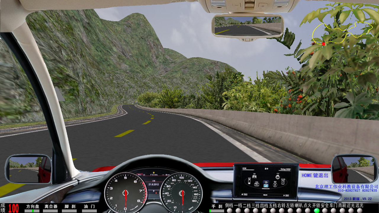 2、 界面顯示:轉(zhuǎn)向、油門、剎車、離合器深淺進(jìn)度、檔位、訓(xùn)練成績(jī),后視鏡(左、右、中)、場(chǎng)景地圖顯示。