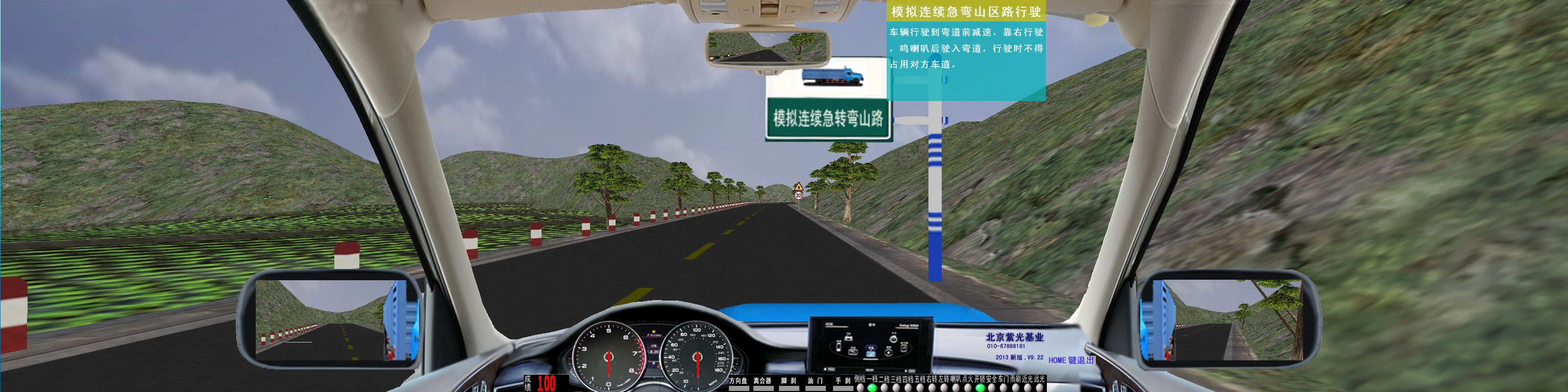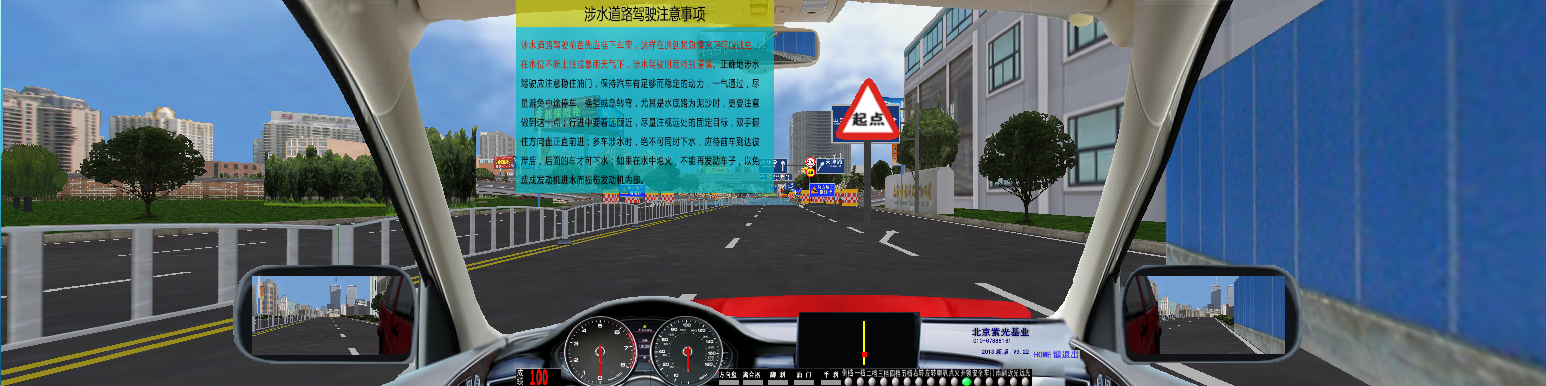 危險場景:視線不清的交通情況下,超車后突然切入他人道引起被超車輛緊急制動、自行車、行人突然橫穿馬路,路面維修,障礙物繞行等 危險場景、專項駕駛:危險道路、眩目道路、爆胎體驗、緊急避讓、趣味駕駛等駕駛科目。炫目道路:(朝九晚五的太陽)炫目會車,炫目駕駛鄉(xiāng)村道路等。泥濘道路:泥濘洼地道路駕駛(方向、制動、驅(qū)動有打滑滯后感)場景模型取鄉(xiāng)村道路,道路變?yōu)槟酀魻顟B(tài)。石子路面:汽車在其上面行駛,遇到剎車時剎不住車,還可汽車還在繼續(xù)滑動,有時還會斜向滑行,極難控制感,汽車在石子路面里滑動。涉水道路:涉水駕駛汽車有水流沖力對車輛的前進阻力感光及側(cè)滑感,輪胎與水下的路壓力減小,驅(qū)動力受到限制,使行駛受阻感覺。專項訓(xùn)練:要附合交通部要求。系統(tǒng)評分:每次駕駛結(jié)束,系統(tǒng)自動評分。山區(qū)到路:突出坡多、彎多、凹凸路面、駕駛環(huán)境復(fù)雜、有側(cè)風(fēng)、有陡坡長坡、溜坡、側(cè)滑(有語音提示)。鄉(xiāng)村道路:含鐵道路口;加油站,公交車站、單行道、農(nóng)田道口等;城市道路:含公交站臺,高架立交橋、公交專用道、十字路口、丁字路口、環(huán)島、隧道、單行道、雙黃線、加油站、商場百貨門口斑馬線天橋,學(xué)校門口及紅綠燈,行人、非機動車亂穿馬路及非機動車等。高速公路:包括收費站(入、停、出、)服務(wù)區(qū)、緊急帶、匝道行駛、超車道、行車道、隧道、立交橋、交通標(biāo)牌標(biāo)線。