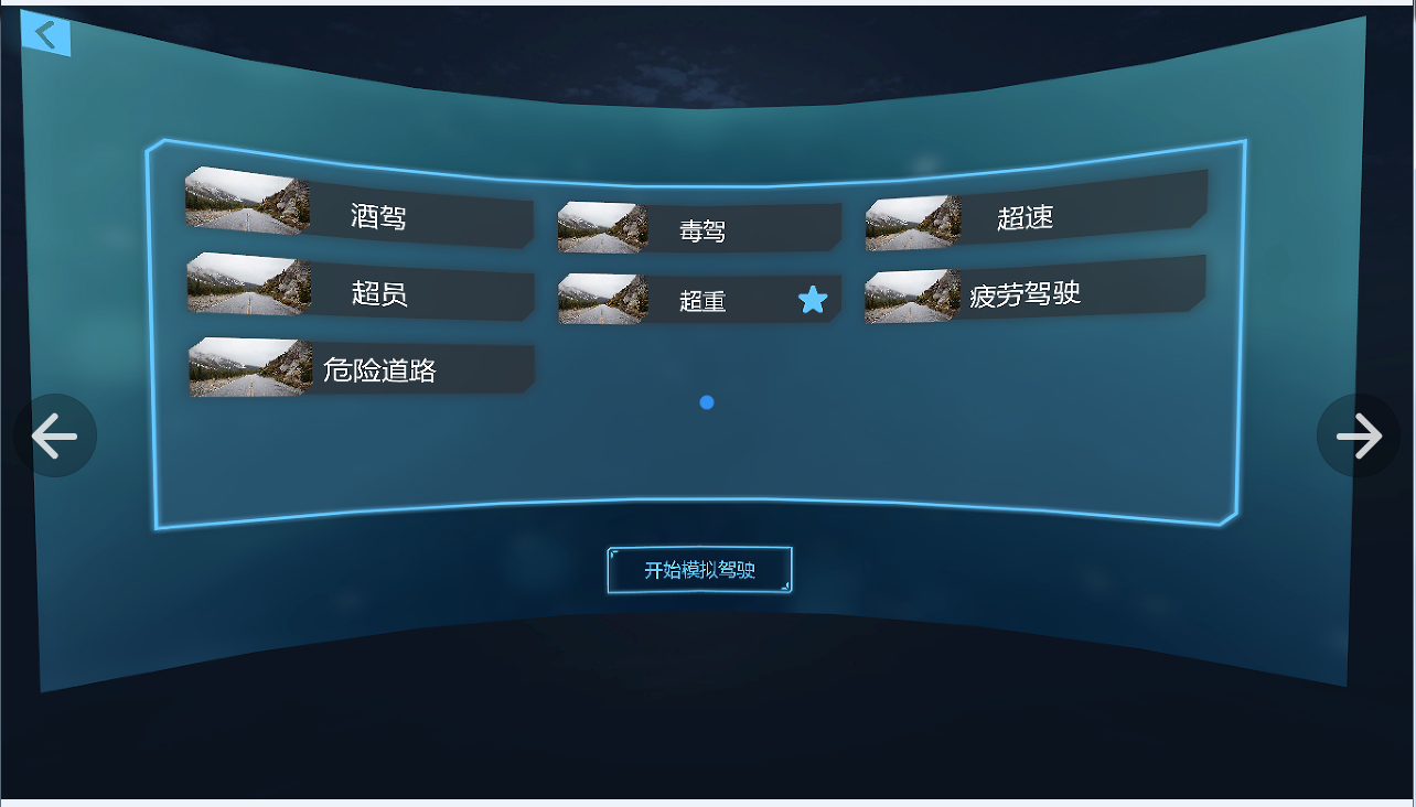 (1)VR動(dòng)畫(huà)交互:酒駕模擬體驗(yàn)、毒駕模擬體驗(yàn)、超速模擬體驗(yàn)、超員模擬體驗(yàn)、超載模擬體驗(yàn)、疲勞駕駛模擬體驗(yàn)、危險(xiǎn)道路模擬體驗(yàn)、緊急避讓模擬體驗(yàn);