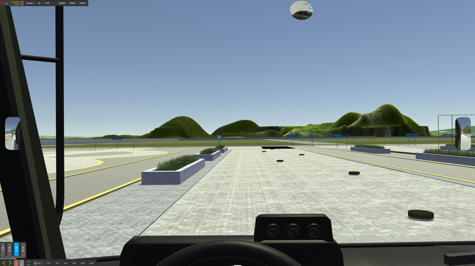 2、軟件主界面:啟動畫面后,界面下方同時顯示:油門、剎車、轉(zhuǎn)向、離合器深淺進度均有顯示。視景120度全新廣角寬頻駕駛模擬,界面顯示各項指示燈、文字提示框、檔位位置、訓練成績,后視鏡(左、右、中)后視鏡可調(diào)節(jié)、訓練線路圖均有顯示。