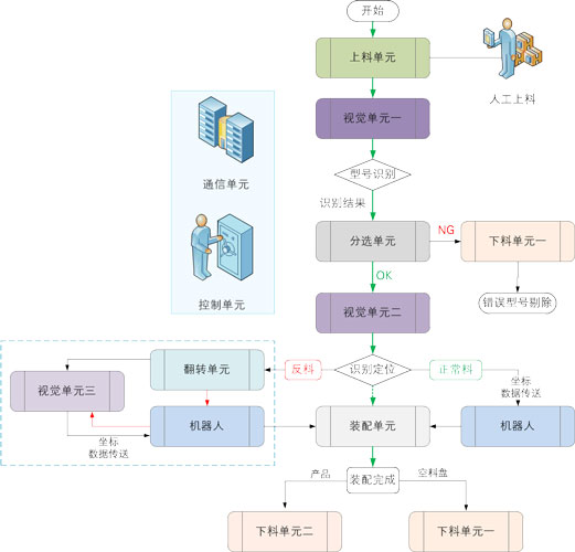 本系統(tǒng)在出廠時,標配了一套應用案例,實現(xiàn)對不同型號象棋的識別、分類、裝配等操作,整個案例運行流程如下: