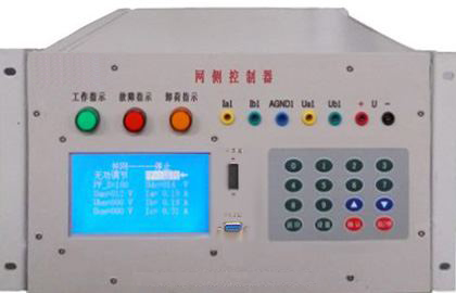 網(wǎng)側(cè)控制器面板安裝有三個(gè)信號(hào)指示燈,16鍵PVC軟鍵盤(pán),240*128點(diǎn)蘭色液晶屏及7個(gè)波形測(cè)試端子。信號(hào)指示燈可對(duì)控制器工作、故障、卸荷狀態(tài)分別給于指示,通過(guò)鍵盤(pán)可完成并網(wǎng)啟動(dòng)/停止設(shè)置。液晶屏可完成三相電流,電壓有效值顯示,直流母線電壓顯示;面板觀測(cè)孔可觀測(cè)電網(wǎng)相電流波形、相電壓波形及直流母線電壓波形。