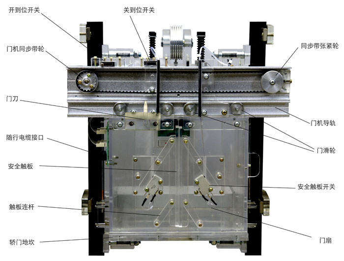 在轎廂門的邊沿上,裝有活動的安全觸板。當門在關閉過程中,安全觸板與乘客或障礙物相接觸時,通過與安全觸板相連的聯桿,觸及裝在轎廂門上的微動開關動作,使門重新打開,避免事故發(fā)生。