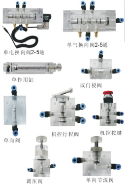 3、透明氣動與PLC實訓裝置各個透明氣動元件成獨立模塊,且裝有帶彈性卡扣底板,可方便、隨意地將元件安放在實訓面板(面板帶“T”溝槽形式的鋁合金型材結(jié)構(gòu))上?;芈反罱硬捎每鞊Q接頭,布局靈活,拆接方便快捷。