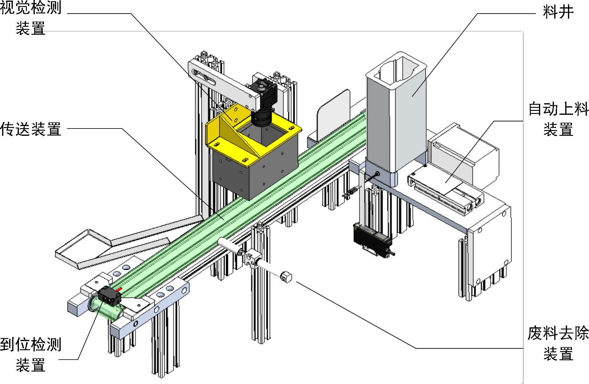 多功能料井為鋁合金材質,可兼容正方形、長方形和圓形三種形狀的物料塊以固定的姿態(tài)到達料井底部,料井底部設置有反射型光纖傳感器,當傳感器檢測到有物料落下時,觸發(fā)自動上料裝置,雙軸氣缸將物料推送到傳送裝置上。傳送裝置上電機配合精密減速器驅動傳送帶模擬真實工廠的流水線,在流水線的中間設置有視覺檢測裝置,檢測合格產(chǎn)品可以到達傳送帶的末端,不合格產(chǎn)品作為廢料,由廢料去除裝置推出傳送帶。在傳送帶末端配有精密傳感器感應產(chǎn)品是否到位。