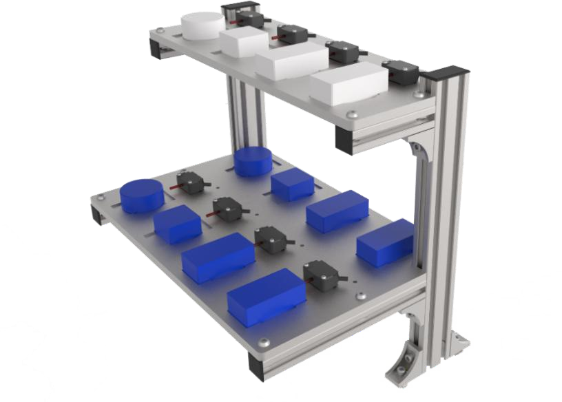 智能料庫分為上下兩層,每層設置 4 個工位。每個工位都可以放置正方形、長方形或圓形的物料。同時,每個工位安裝有傳感檢測裝置,可自行判斷此工位是否有物料。
