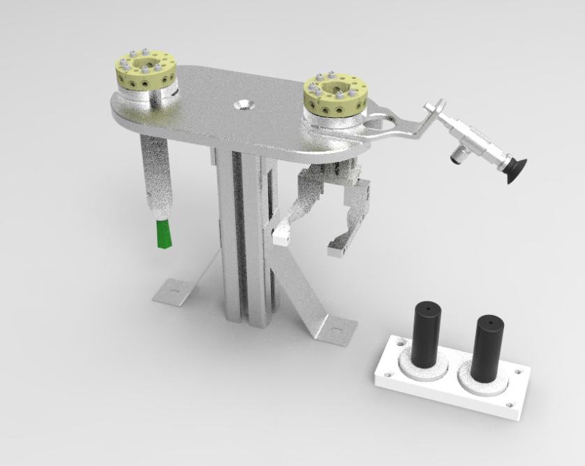 6、機器人工具模塊機器人末端工具是機器人的執(zhí)行單元,如圖 8 所示此模塊包括尖點輔助工具、筆工具、氣動夾爪工具和氣動吸盤工具。尖點輔助工具形狀為圓錐,具有TCP 校準功能,同時可以模擬去毛刺、涂膠工具。筆工具、夾爪工具和吸盤工具都配備了機械快換工具,與機器人法蘭盤的機械快換工具配套使用,可實現(xiàn)工具的快速更換。筆工具內(nèi)部設置有緩沖裝置,可以有效減少學生初步學習機器人操作時,由于不熟練導致剛性碰撞產(chǎn)生對工具的損壞。筆工具可以完成軌跡、寫字和繪畫等實驗內(nèi)容,彩筆可快速更換。夾爪工具和吸盤工具采用國際知名品牌, 用于物料的抓取和吸附。