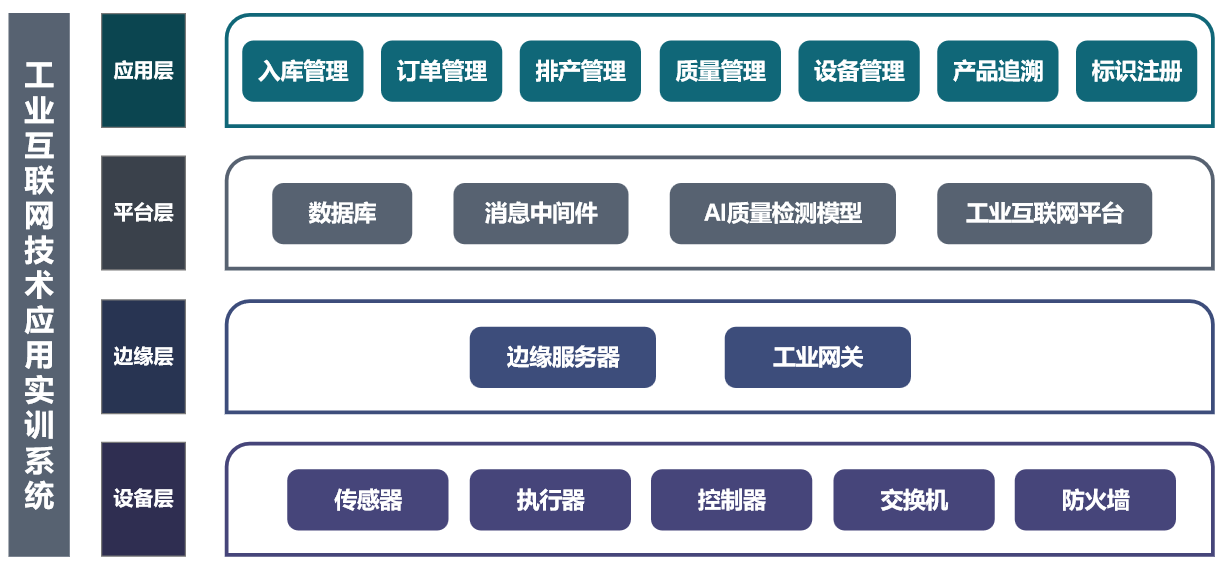 工業(yè)互聯(lián)網(wǎng)技術(shù)應(yīng)用實(shí)訓(xùn)臺(tái)采用四層架構(gòu),從底到頂依次為設(shè)備層、邊緣層、平臺(tái)層、應(yīng)用層。