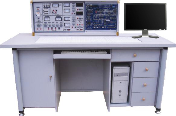 一桌為二座,桌面中央設置通用電路插板,元件盒在其上接插成實驗電路完成實驗。桌子左右各有一個柜,柜中存放元器件、貯存板及電腦,中間上層放置鍵盤、