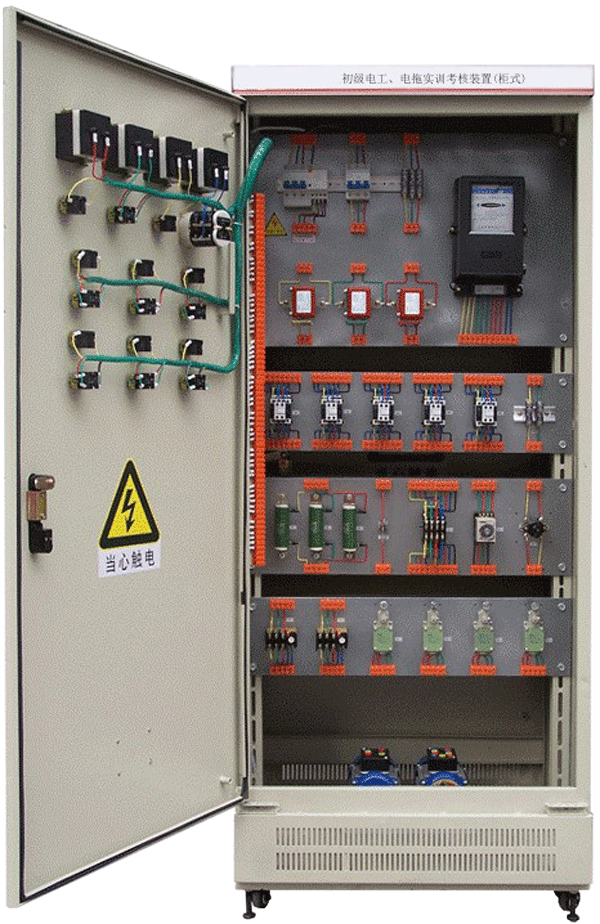 該裝置按標(biāo)準(zhǔn)電氣控制柜設(shè)計(jì)制造規(guī)格,充分利用雙面位置,柜內(nèi)裝有完成各種照明電路所需的單相電度表、日光燈、單聯(lián)開關(guān)、插座、感應(yīng)開關(guān)、漏電開關(guān)等,以及電氣控制所需要的多種低壓電器,如漏電斷路器、熔斷器、電流互感器、交流接觸器、時(shí)間繼電器、熱繼電器、中間繼電器、行程開關(guān)、按鈕、信號(hào)燈、轉(zhuǎn)換開關(guān)、電壓表、電流表、功率表及電度表等,為了延長(zhǎng)電器使用壽命,各電器的接點(diǎn)都與接線端子相連,再由接線端子與被控制電氣連接。