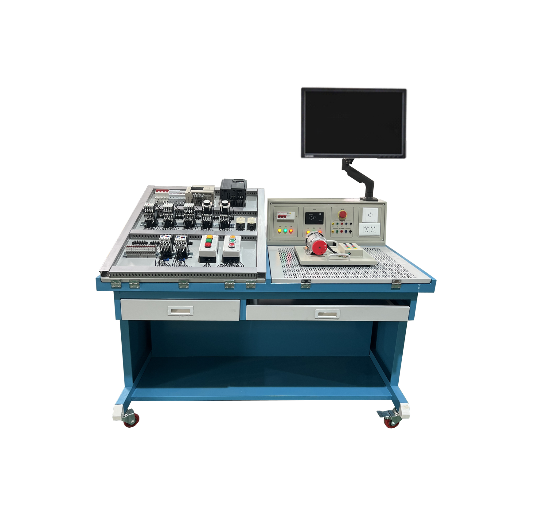 LG-WDG02A型 通用電工競賽訓(xùn)練平臺由實訓(xùn)屏(內(nèi)置電源)、實訓(xùn)桌(含鍵盤)、儲物柜三大部分組成。鋼制表面經(jīng)高溫噴塑處理,美觀大方且有效起到防銹絕緣的作用;電源箱的布局依次為電源保護裝置、電源指示裝置、電源輸出;實訓(xùn)桌左側(cè)安裝有角度可以調(diào)節(jié)的嵌入式的考核平臺1張,所有元器件均采用端子引出,學(xué)生接線只需在端子上進行接線,可以有效的保護元器件,轉(zhuǎn)接端子采用接插兩用端子排,方便與元器件和實訓(xùn)電源屏的連接,右側(cè)裝有網(wǎng)孔板一塊,角度可調(diào)嵌入式安裝;實驗桌底部裝有至少4個導(dǎo)向輪,方便設(shè)備移動;儲物柜采用標準結(jié)構(gòu)和抽屜式,用于存放工具以及實訓(xùn)資料。電腦通過可調(diào)節(jié)電腦支架安裝于電源屏的上方。