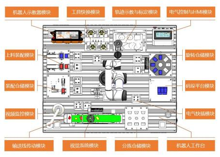 工作臺整體由兩個(gè)基礎(chǔ)臺拼接而成,更具空間靈活,拆卸方便等特點(diǎn)。臺面采用標(biāo)準(zhǔn)鋁型材,機(jī)器人 及功能模塊可根據(jù)需求改變布局位置,所有功能模塊采用手?jǐn)Q螺栓方式固定,可實(shí)現(xiàn)無工具快速拆裝與更 換。每個(gè)模塊電氣部分配置了獨(dú)立的電氣接線盒和快速航插,可實(shí)現(xiàn)模塊整體機(jī)械和電氣快速安裝部署, 還可根據(jù)需求更換或添加功能模塊進(jìn)行功能擴(kuò)展。