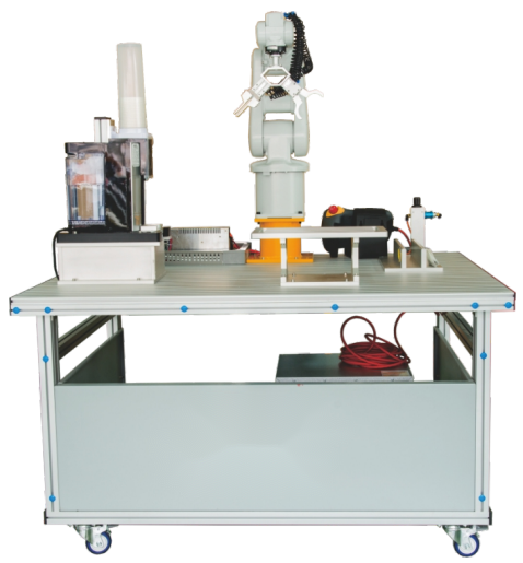 該裝置采用鋁木結(jié)構(gòu)試訓(xùn)臺(tái),由實(shí)訓(xùn)桌、飲水機(jī)(自動(dòng)售賣機(jī))、取杯器、工業(yè)機(jī)器人(帶復(fù)合手爪),底座(支架)等幾個(gè)部分組成,利用工業(yè)機(jī)器人完成茶藝流程一系列的動(dòng)作。該設(shè)備圍繞工業(yè)機(jī)器人展開內(nèi)容,從通訊、機(jī)械、電氣三方面突出顯示其在服務(wù)業(yè)中的運(yùn)用,為學(xué)習(xí)自動(dòng)化提供全面教學(xué)便利。