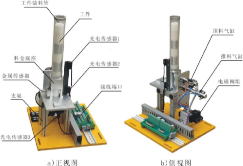 主要由井式工件庫、推料氣缸、物料臺、光電傳感器、磁性開關(guān)、電磁閥、支架、機(jī)械零部件構(gòu)成。 |