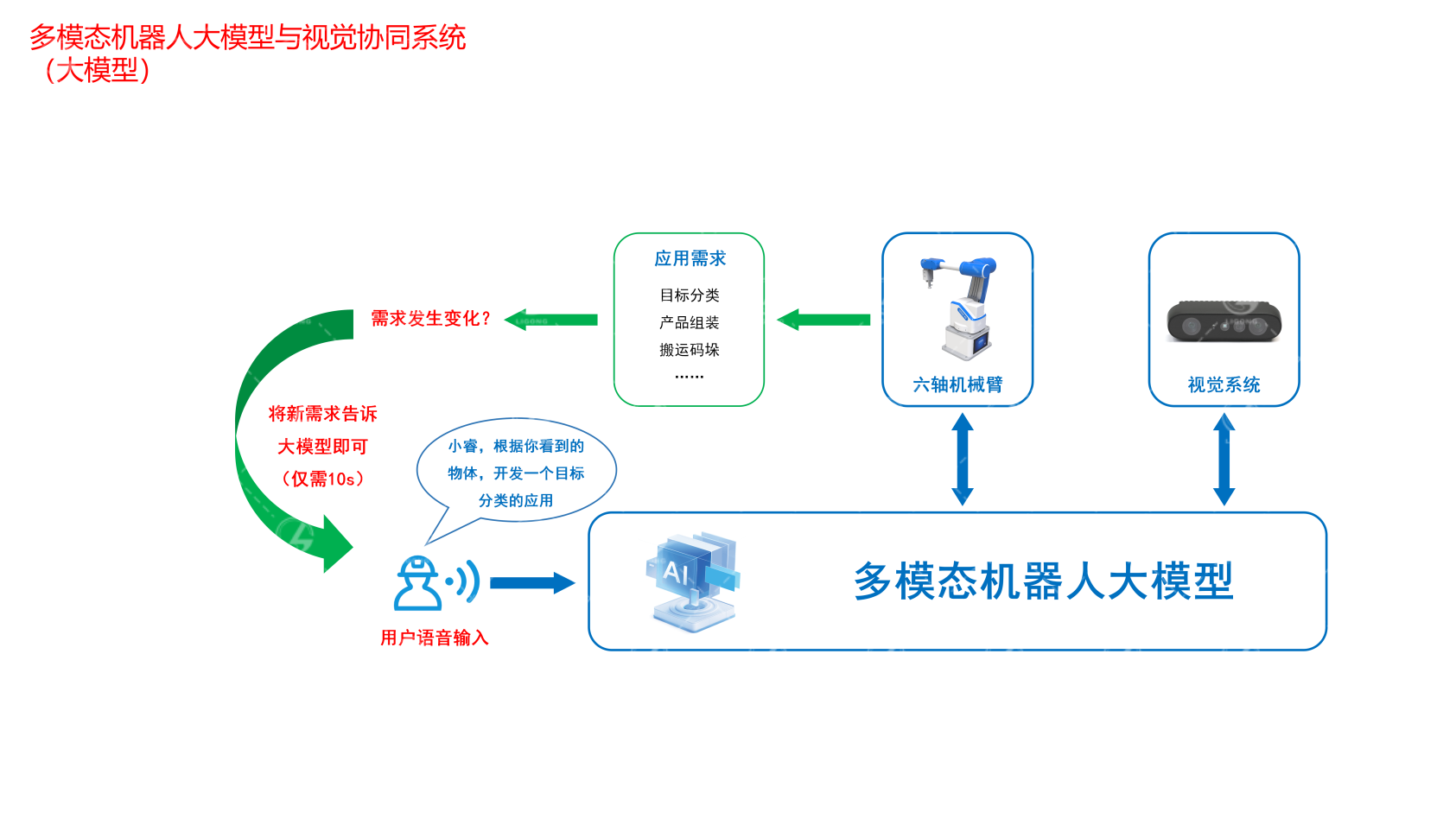 隨著人工智能技術(shù)的飛速發(fā)展,特別是大模型(如深度學(xué)習(xí)模型、生成式AI等)的廣泛應(yīng)用,機(jī)器人領(lǐng)域正迎來(lái)一場(chǎng)前所未有的變革。大模型以其強(qiáng)大的數(shù)據(jù)處理能力、泛化能力和跨模態(tài)融合能力,為機(jī)器人提供了前所未有的智能水平。在這一背景下,研發(fā)了多模態(tài)機(jī)器人大模型與視覺(jué)協(xié)同系統(tǒng),該系統(tǒng)以大模型為核心,以機(jī)器人為執(zhí)行結(jié)構(gòu),以視覺(jué)系統(tǒng)為環(huán)境感知單元,可以快速地實(shí)現(xiàn)對(duì)多種應(yīng)用需求的自主分析、理解和開(kāi)發(fā),可以有效的提高生產(chǎn)效率。同時(shí),為有效的服務(wù)于用戶的科研、開(kāi)發(fā)等需求,該系統(tǒng)還開(kāi)放大模型訓(xùn)練、部署的全部流程,并開(kāi)放全部的機(jī)器人、視覺(jué)、語(yǔ)音的源代碼,用戶可以在此基礎(chǔ)上,進(jìn)行多個(gè)方向的探索和實(shí)踐。