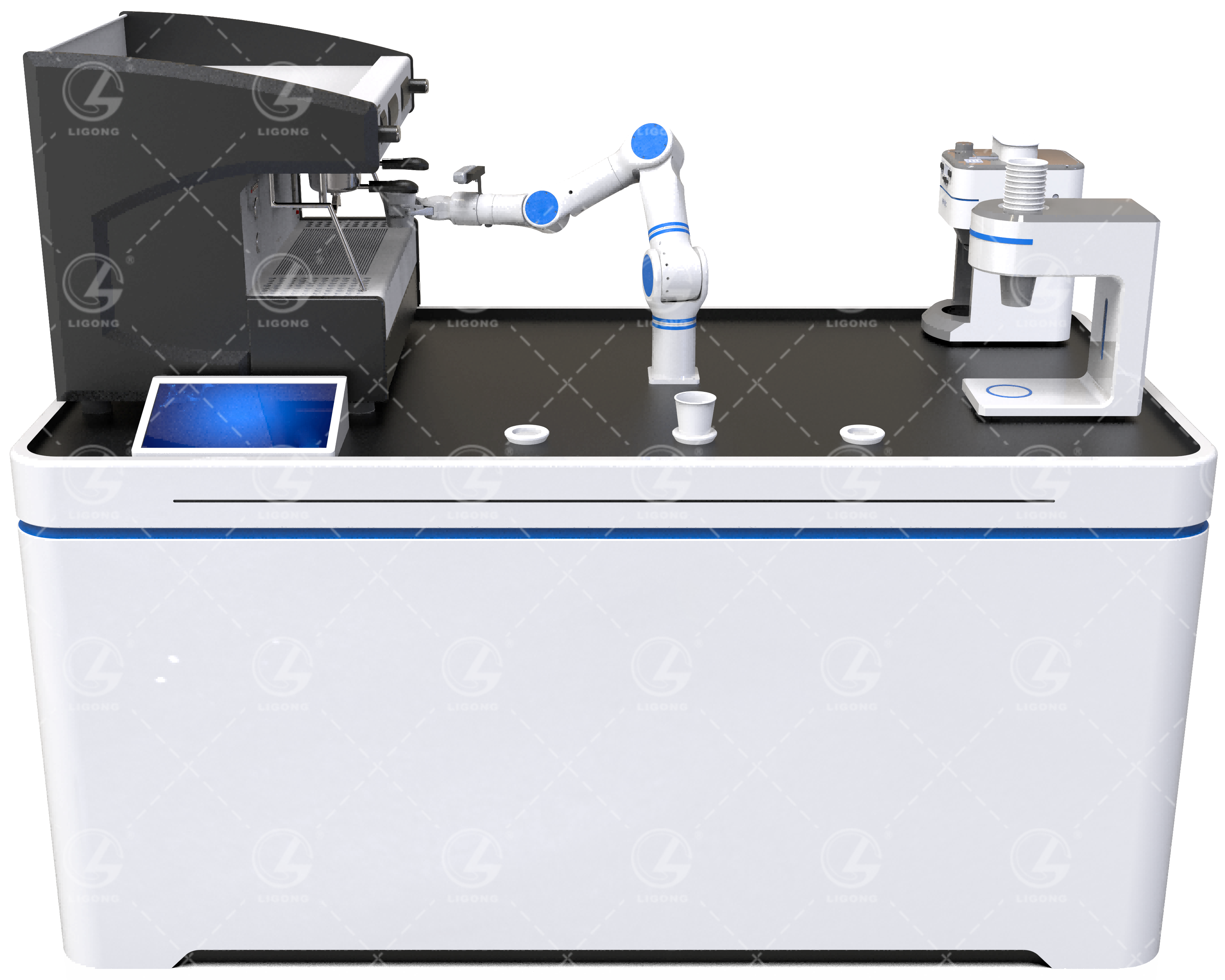 (3)咖啡機(jī):全自動(dòng)咖啡機(jī),支持多種預(yù)設(shè)飲品配方,具備自動(dòng)清洗功能,可通過通訊接口與機(jī)器人聯(lián)動(dòng)控制;