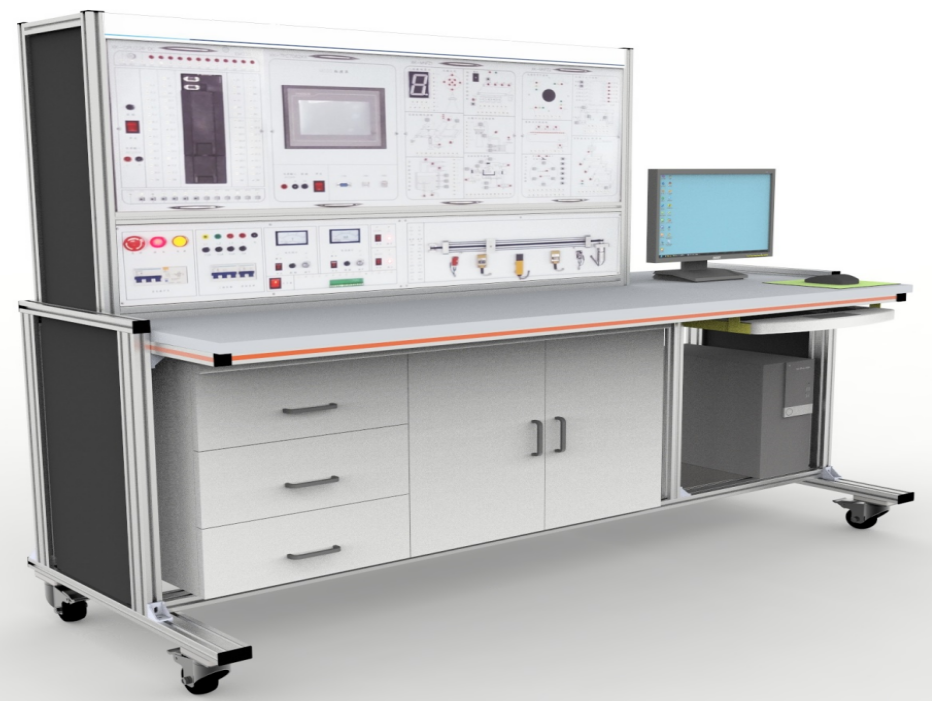 2、臺(tái)架構(gòu)成:實(shí)訓(xùn)臺(tái)采用工業(yè)鋁型材加工。桌面下面放置儲(chǔ)物柜,左側(cè)有3層抽屜,用于存放工具以及實(shí)訓(xùn)資料,右側(cè)為雙拉門式設(shè)計(jì),可以放置實(shí)訓(xùn)掛箱。底部裝有四個(gè)帶鎖止功能的萬向輪。柜體后下側(cè)留有電源輸入線。預(yù)留計(jì)算機(jī)放置位置。