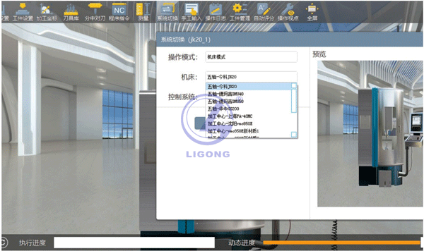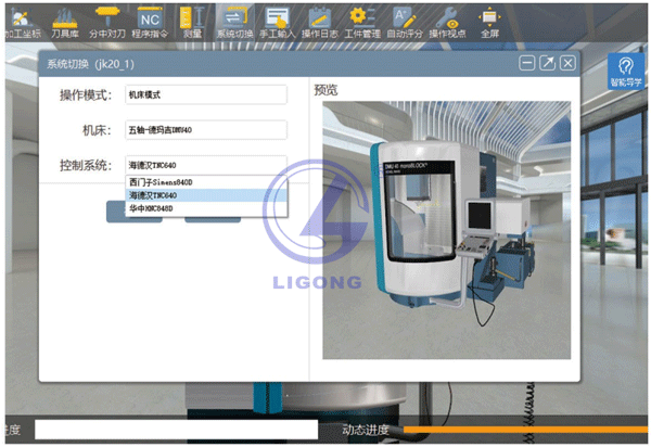 LGS-SX02型 數(shù)控車銑加工一體化創(chuàng)新仿真實(shí)訓(xùn)平臺(tái)的數(shù)字孿生機(jī)床仿真部分,操作極為簡單,放大、縮小、旋轉(zhuǎn)、平移、觸控等等。學(xué)生無需特殊訓(xùn)練,即可直接上手使用??芍С职ㄈS的數(shù)控機(jī)床如法蘭克、西門子、華中、廣數(shù),以及多軸的數(shù)控機(jī)床如西門子840D、華中848D、海德漢TNC640等主流操作系統(tǒng),支持加工中心、車床、斜床等數(shù)控機(jī)床設(shè)備,目前數(shù)控I8多軸智能訓(xùn)練機(jī)包含了11套不同類型數(shù)控系統(tǒng)設(shè)備。