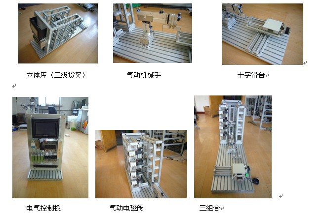 LGZH-02 柔性三組合機電一體化創(chuàng)新模型實現(xiàn)動作為:首先立體庫堆垛機具有水平垂直運動,由步進(jìn)電機拖動,帶動貨叉,進(jìn)行貨物存取,貨叉為三級機械傳動。氣動機械手可實現(xiàn)手爪抓取,提升,轉(zhuǎn)半圈,放下,松開手爪。十字滑臺可走出四角上一周的四個位置,上方裝有筆架,可以繪圖寫字,上方還裝有接近開關(guān)和顏色開關(guān)及支架,可對滑臺上的物體進(jìn)行識別。