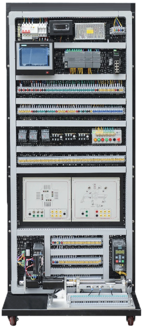 工業(yè)自動(dòng)化網(wǎng)絡(luò)控制實(shí)訓(xùn)平臺(tái)以網(wǎng)孔架為基礎(chǔ)實(shí)訓(xùn)單元,仿真企業(yè)真實(shí)環(huán)境,可開展PLC系統(tǒng)基礎(chǔ)模塊連接實(shí)訓(xùn)。該工作臺(tái)采用單面實(shí)訓(xùn)方式,實(shí)訓(xùn)區(qū)主要由電源單元、PLC單元、PLC學(xué)習(xí)箱單元、基礎(chǔ)實(shí)訓(xùn)單元、擴(kuò)展實(shí)訓(xùn)區(qū)(伺服控制小車運(yùn)動(dòng)實(shí)訓(xùn)單元、步進(jìn)電機(jī)單元和變頻器單元)六大部分組成。