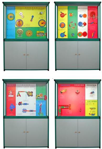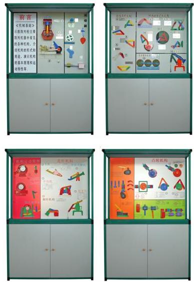 本設(shè)備是根據(jù)大中專院校、職業(yè)學(xué)校的教學(xué)大綱設(shè)計(jì)的機(jī)械陳列柜,《機(jī)械基礎(chǔ)》電化教學(xué)設(shè)備。陳列柜共分十個柜和一個電腦控制臺,進(jìn)行多媒體聲控同步解說演示。由PC機(jī)電腦控制順序或任選運(yùn)行每個柜模型動作,同時電腦播放圖像或三維動畫同步模型動作。