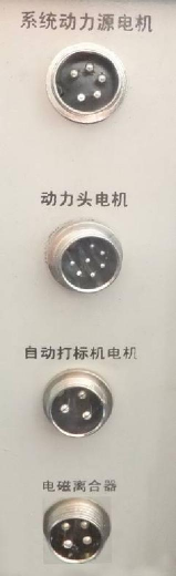 (1)動力系統(tǒng)接口單元操作面板主要由四個開爾文插座組成,從上到下依次為五芯、七芯、 三芯和四芯插座。分別用于連接系統(tǒng)動力源電機(jī)、動力頭電機(jī)、自動打標(biāo)機(jī)電機(jī)(含急停按鈕)、 電磁離合器(含限位開關(guān))。