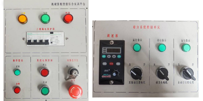 (2)三相電源指示(U 相、V 相、W 相)由 3 個不同顏色的指示燈組成,實(shí)時監(jiān)測實(shí)訓(xùn)平臺三相交流電源,正常通電情況下三個指 示燈都是點(diǎn)亮的。