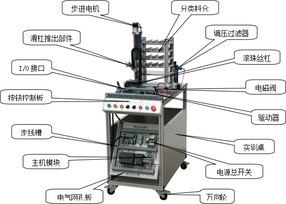 由滾珠絲杠、滑桿推出部件、分類料倉(cāng)、步進(jìn)電機(jī)、步進(jìn)驅(qū)動(dòng)器、電感傳感器、開關(guān)電源、可編程序控制器、按鈕、I/O接口板、通訊接口板、電氣網(wǎng)孔板、多種類型電磁閥及氣缸組成,主要完成按工件類型分類,將工件推入料倉(cāng)。