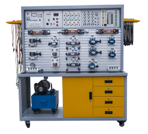 LGY-YC01A型液壓傳動(dòng)綜合實(shí)訓(xùn)裝備是由實(shí)訓(xùn)臺(tái)桌、液壓元件、液壓動(dòng)力源、電氣控制部分、PLC等五大部分組成;實(shí)訓(xùn)臺(tái)桌最上方為電氣模塊區(qū)包含電源模塊、油泵控制模塊、按鈕模塊、繼電器模塊和PLC模塊通過模塊式組合布局更加靈活方便,也可根據(jù)自己所需增減模塊來升級(jí)設(shè)備;實(shí)訓(xùn)臺(tái)桌中間是實(shí)驗(yàn)、實(shí)訓(xùn)區(qū),是由帶T型的型材組成,根據(jù)液壓實(shí)訓(xùn)回路,所有液壓元件可方便的在實(shí)訓(xùn)面板上自由搭建;實(shí)訓(xùn)臺(tái)桌下方為工具柜和液壓源置放處,可為液壓系統(tǒng)提供必要的液壓動(dòng)力源;液壓元件采用力士樂技術(shù)的液壓元件,質(zhì)量可靠,性能穩(wěn)定,所有液壓元件閥板底部安裝一種塑料快換底板,可方便的在實(shí)訓(xùn)區(qū)的任何區(qū)域快速搭建,安裝一個(gè)液壓回路只需5分鐘左右,快速高效!通過實(shí)訓(xùn)教學(xué)活動(dòng)改設(shè)備可學(xué)習(xí)到液壓傳動(dòng)、傳動(dòng)繼電器控制、PLC自動(dòng)控制、傳感器應(yīng)用技術(shù)等多個(gè)技術(shù)!