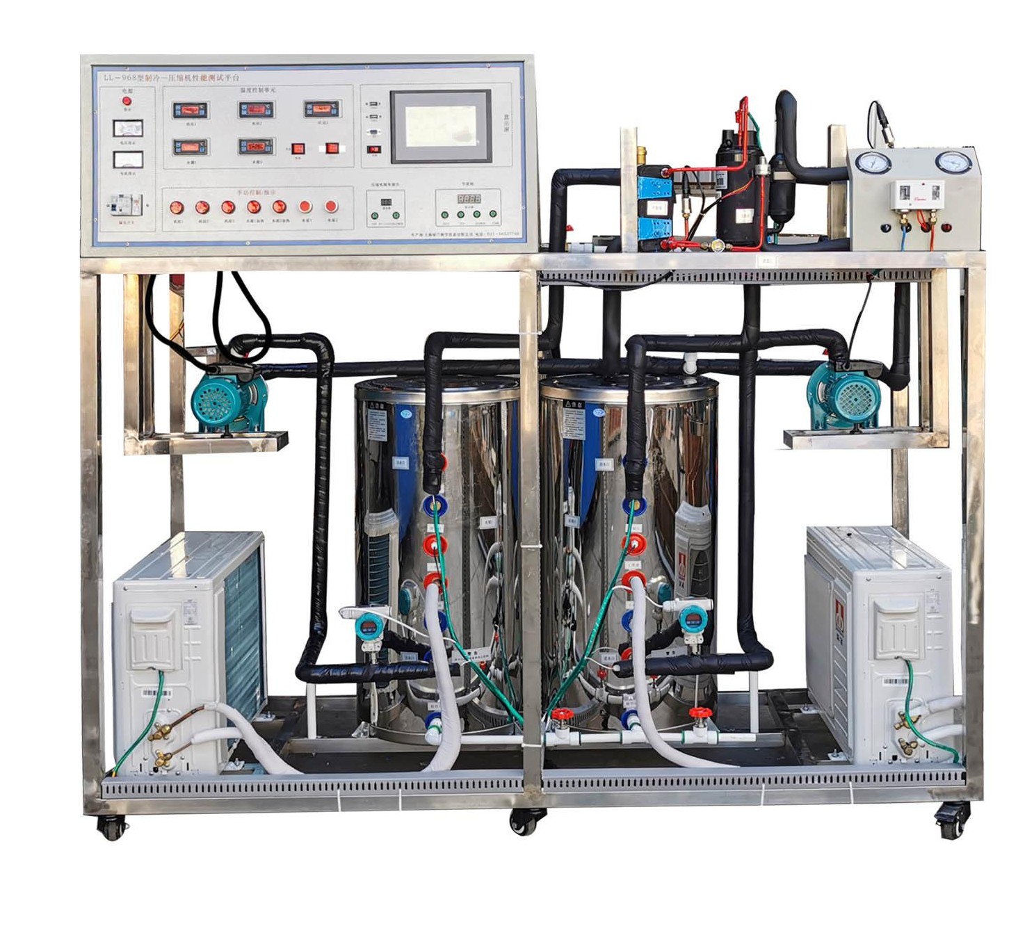LGZL-RB01型 熱泵-壓縮機(jī)性能實(shí)驗(yàn)系統(tǒng)采用熱平衡法測量熱泵與制冷壓縮機(jī)的性能。系統(tǒng)主要由制冷壓縮機(jī)、蒸發(fā)器、冷凝器、恒溫水箱和電子膨脹閥等組成。采用傳感器和檢測儀表采集蒸汽壓縮式制冷循環(huán)過程中的溫度、壓力、流量、壓縮機(jī)功率、電流、頻率等狀態(tài)參數(shù),經(jīng)自行研制的數(shù)據(jù)采集板卡連接到計算機(jī),基于面向?qū)ο蠹夹g(shù)開發(fā)的具有實(shí)時性高,界面設(shè)計人性化等特點(diǎn)的測控軟件實(shí)現(xiàn)熱力循環(huán)過程實(shí)時動態(tài)顯示、性能參數(shù)測試和計算,構(gòu)成具有檢測、分析、記錄、測試、繪圖等多功能一體化的熱泵-壓縮機(jī)性能實(shí)驗(yàn)系統(tǒng)。基于基礎(chǔ)型機(jī)組,增加如下內(nèi)容:學(xué)生設(shè)計型與創(chuàng)新型實(shí)驗(yàn)。