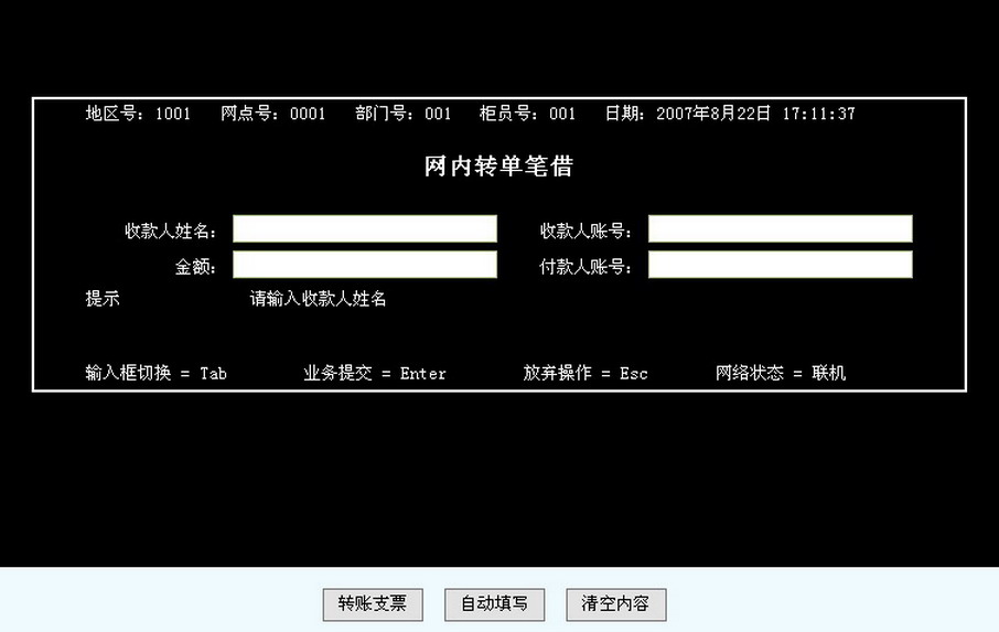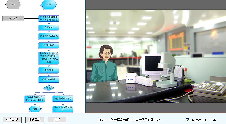 學生在經過基礎的實務課程學習后,將被置于一個完全仿真的現(xiàn)代商業(yè)銀行的工作環(huán)境中,面對銀行每日的工作開始進行模擬實操。學生們將會面對虛擬的客戶提出的各種要求來進行相應的處理。對于學生來講,實操過程中的所有操作都是自由的,他們需要通過完全自主的思考來判斷下一步的操作。譬如客戶提出的支票轉帳請求是否受理?如果不受理理由是什么?(譬如涉及支票的鑒別、簽章的鑒別等)接受以后如何操作?同時模擬系統(tǒng)根據內置的業(yè)務邏輯自動判斷學生操作的正確性,對其業(yè)務能力進行實時的評價和記錄,并且將結果及時反饋給學生。通過每一步操作的自主思考和系統(tǒng)不斷的提示加強學生對于業(yè)務處理的理解,幫助其提高業(yè)務操作的熟練程度,并且培養(yǎng)其判斷分析能力。實操訓練的內容完全參照日常銀行業(yè)務操作所涉及的范圍,同時也可以根據實驗課程主題的要求進行具體的靈活配置。