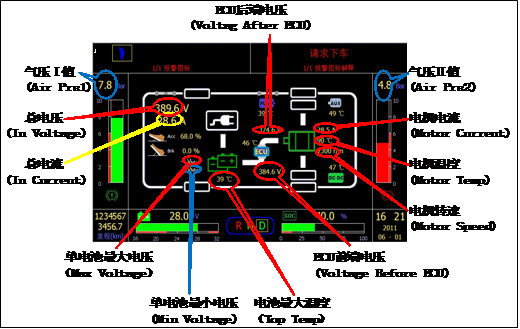 48V電動汽車儀表帶CAN通訊; 包含指示燈、電流電壓指示、電量指示、能量流程圖、REDAY/OK燈; |