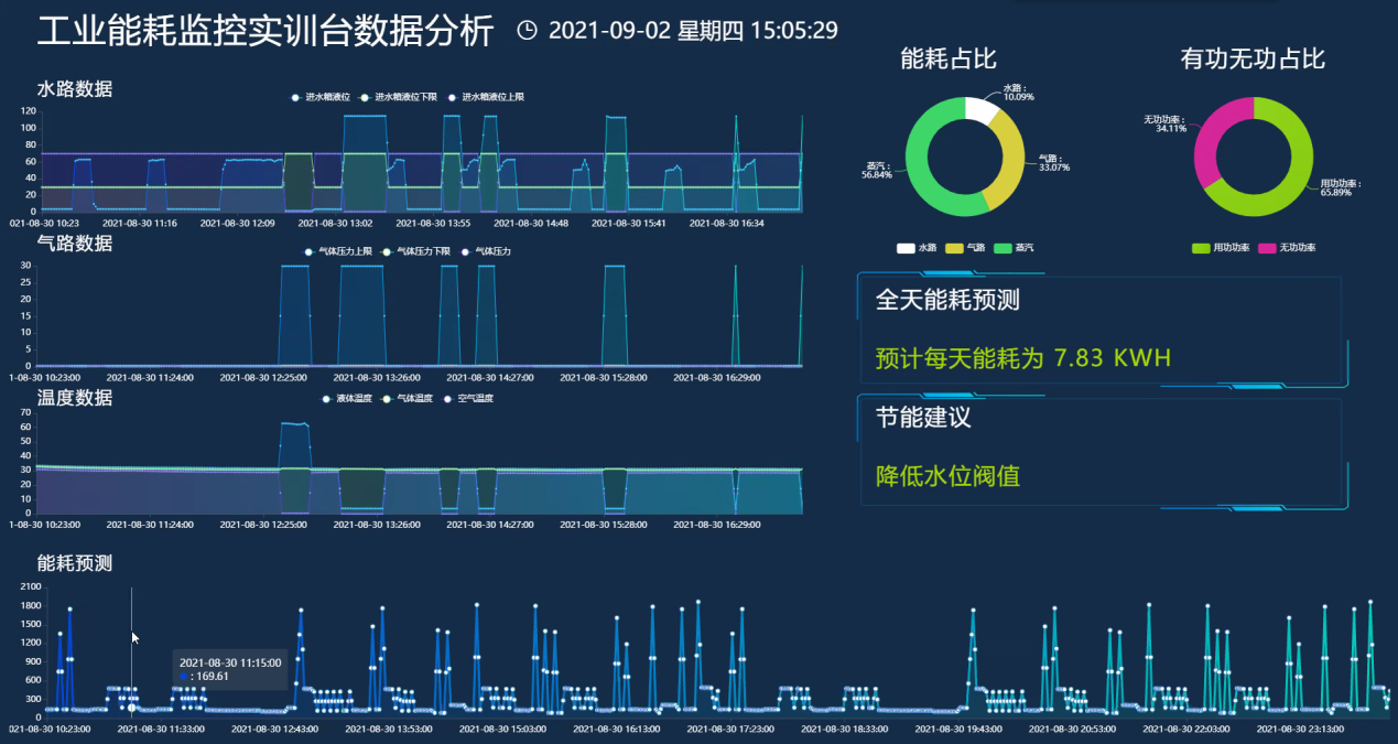 LGHL-04型 工業(yè)互聯(lián)能耗監(jiān)控實訓(xùn)臺以水、氣、電能耗監(jiān)測為背景,采用液位計、流量計、溫度變送器、壓力變送器、電磁閥、水泵、氣泵、電氣控制箱、水箱等裝置模擬工業(yè)場景下的水循環(huán)、氣循環(huán)、電能監(jiān)測常見的過程控制系統(tǒng)。其中水箱作為液體盛放和氣體導(dǎo)入的氣液混合容器,模擬化工行業(yè)常見的化工產(chǎn)品制備工藝場景。通過現(xiàn)場監(jiān)控裝置及傳輸模塊,將液位、流量、壓力、水溫、氣溫、電壓、電流、電量等過程控制參數(shù)進(jìn)行數(shù)據(jù)采集,傳輸?shù)侥茉垂芾砥脚_,達(dá)到工業(yè)水、電、氣等至少三種數(shù)據(jù)采集控制、數(shù)據(jù)傳輸、數(shù)據(jù)存儲、數(shù)據(jù)分析及可視化展示的目的。