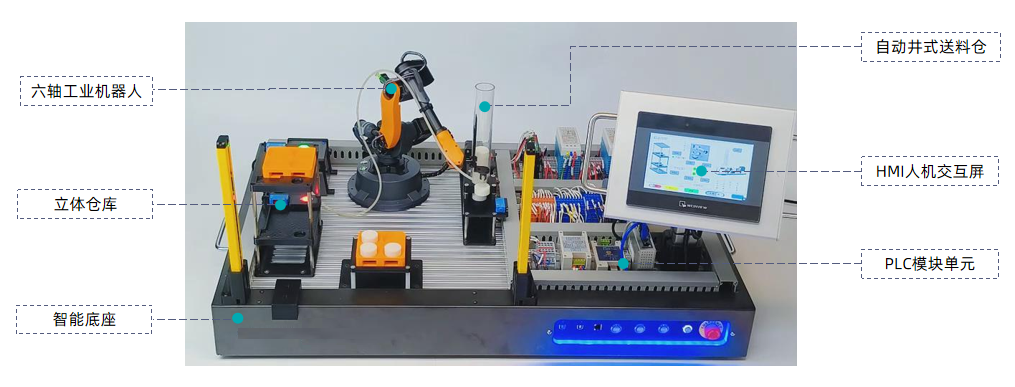 LG-JQRSX型 機(jī)器人PLC實訓(xùn)工作站由桌面級工業(yè)六軸機(jī)器人、自動井式出料機(jī)、PLC控制模塊、立體倉儲單元及HMI人機(jī)交互單元組成。