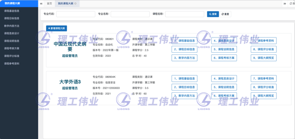 課程大綱管理模塊針對每一門課程,詳細的定義了課程的詳細內(nèi)容,包括基本信息,授課教師,教學目標,教學單元,教學方式,評價方式等等。
