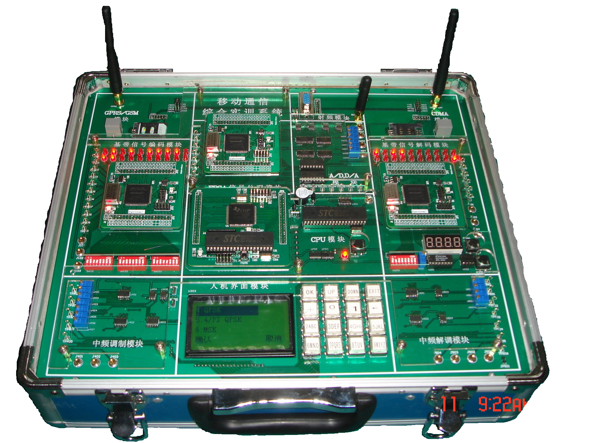 本移動(dòng)通信實(shí)驗(yàn)箱由主底板加ARM、FPGA、GPRS/CDMA、交換接口、傳感器等五個(gè)獨(dú)立的模塊有機(jī)的組合而成,是集移動(dòng)終端、基站、交換機(jī)、傳感器網(wǎng)絡(luò)功能于一體的移動(dòng)通信系統(tǒng)。該移動(dòng)通信實(shí)驗(yàn)箱系統(tǒng)二次開(kāi)發(fā)功能強(qiáng)大,可做設(shè)計(jì)性、應(yīng)用性、研究性實(shí)驗(yàn),有利于培養(yǎng)學(xué)生的動(dòng)手能力。